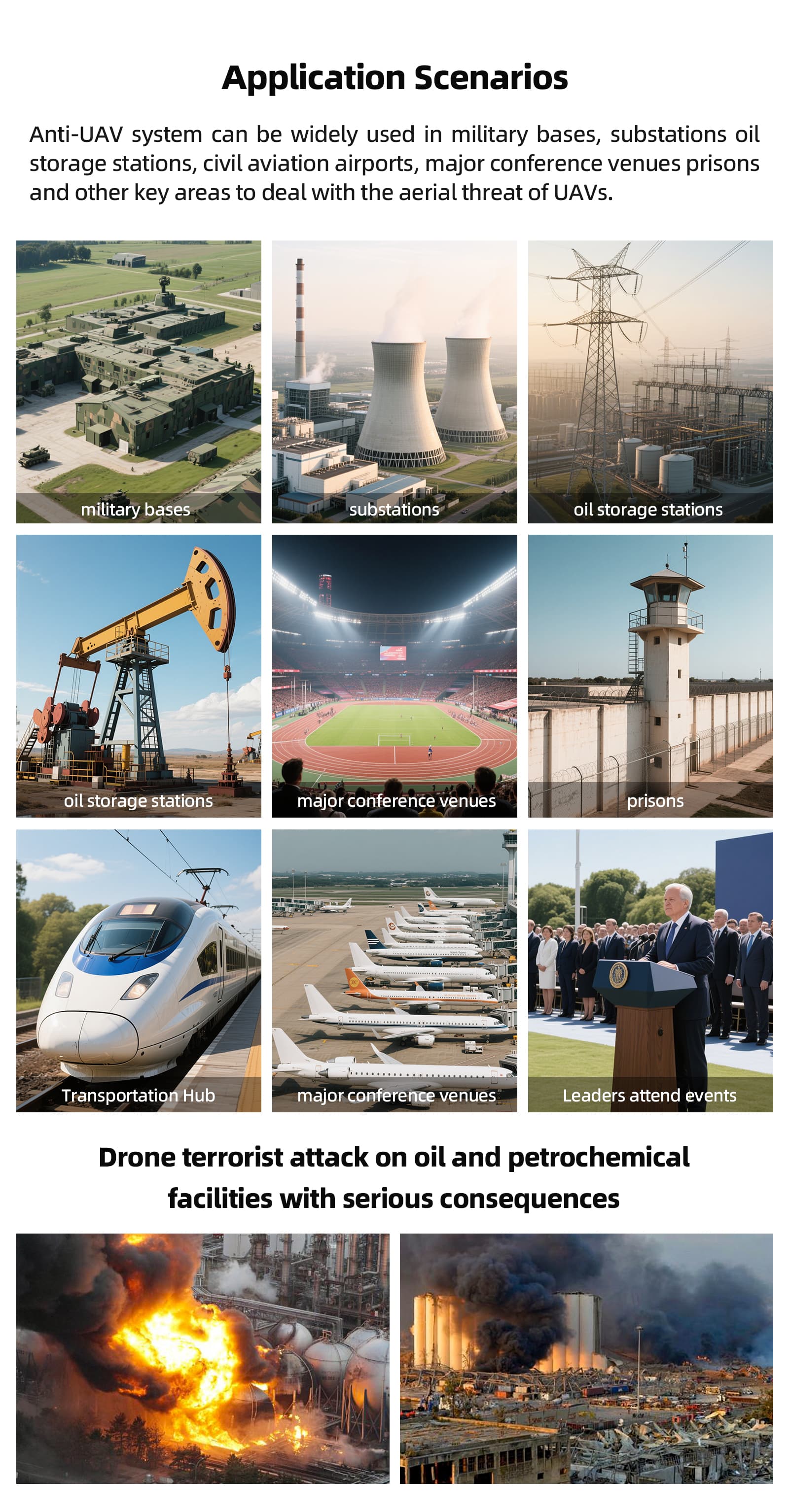 ▶During operation, the equipment identifies and decodesilega UAVs through radio frequency scanning features.Multiple electricaldetection algorithmsallow for presence detection, direction finding, human-machine positioning, ID recognition, image parsing, and support for multi network TDOA positioning; Employing eigh band electromagnetic suppresson technology, it blocks drone control and transmis ion links as wellas navigation signals,forcing drones to return orland; Uti izin four-mode navigation deception technology, it emitsfalse satelienavigation signalsto infiltrate the drone's system, thus prohibiting, denying, or repelling drones.
